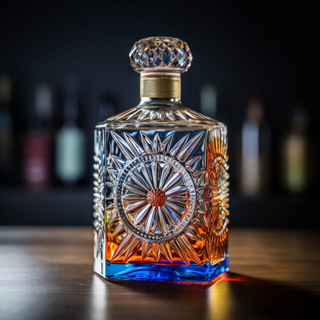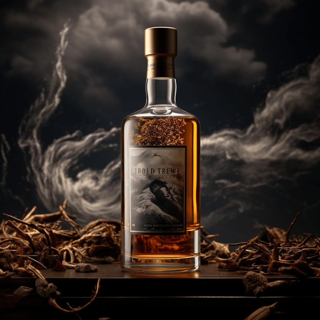 Different whiskey bottle designs where the AI was prompted to take inspitration from traditional Indian motifs and a tornado.